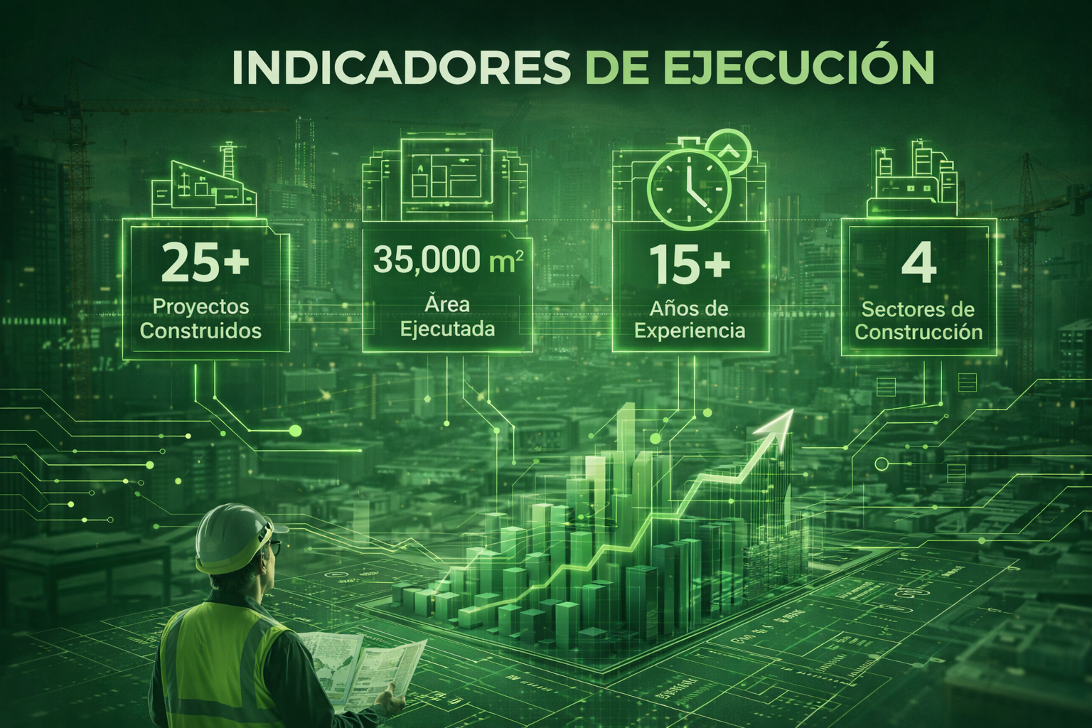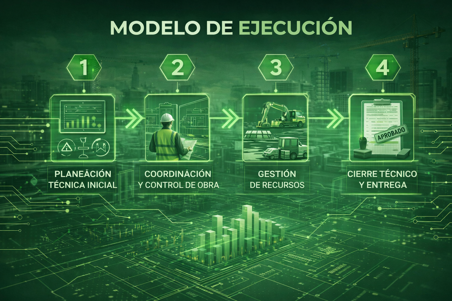 Ejecución de proyectos con dirección técnica integral, control estructural y gestión eficiente de recursos.